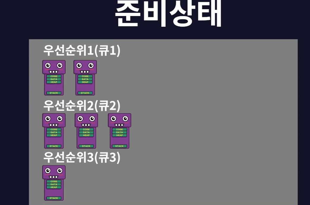 프로세스가 실행상태에서 준비상태로 돌아갈 때 운영체제는 해당프로세스의 우선순위를 보고 그에 맞는 준비 큐에 넣음. cpu스케쥴러는 준비상태의 다중큐에 들어있는 프로세스들 중에 적당한 프로세스를 선택해서 실행상태로 전환시킴.