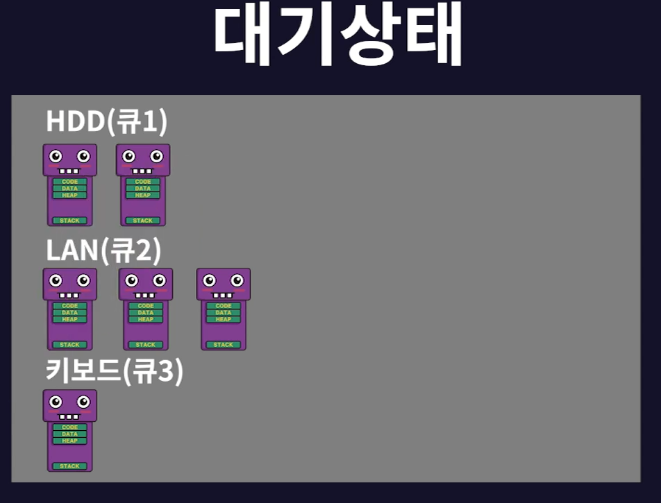 프로세스가 실행상태에서 I/O요청받아 대기상태로 오게 되면 I/O작업 종류에 따라 분류된 큐에 들어가게 됨. 그리고 그 작업이 완료되면 다시 그 해당 큐를 뒤져서 꺼내감.