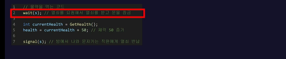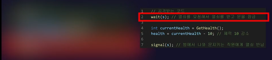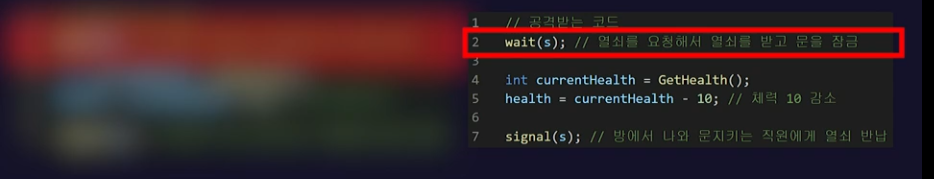 signal()함수가 호출되서 열쇠가 반납되야 하고, 그제서야 공격받는 코드의 wait()함수가 종료됨