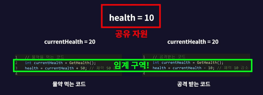 -> 이런 이유는 health라는 공유자원을 여러 프로세스가 동시에 사용했기 때문. 따라서 여러 프로세스가 동시에 사용되는 영역을 정의했는데 이를 '임계구역'이라고 함.