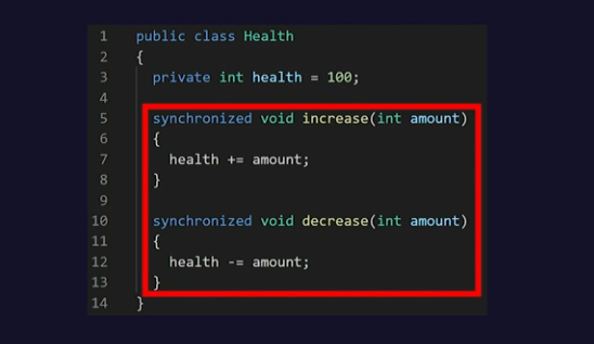만약 프로세스 A에서 increase()를 실행하면, 프로세스 B에서는 increase()함수 뿐 아니라 synchronized함수가 붙은 decrease()도 실행할 수 없음.