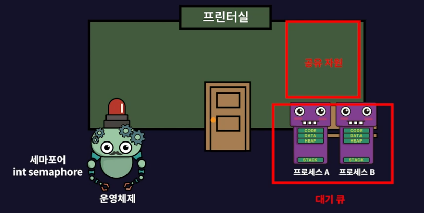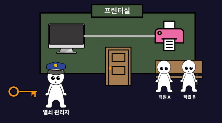 ex) 프린터를 서로 두명이 이용하는 경우, 동시에 프린트했더니 프린트가 두명 꺼가 섞여서 나오네?? 이를 방지하기 위해 프린터실 안에 들어가서 프린트하도록 열쇠관리자가 키를 관리하면서 프린터실에 들어가는 사람한테 키를 주고 키없으면 못들어가게 함. 들어간사람이 나오면 키 반납하고 다음사람 들어감. 단순무식.