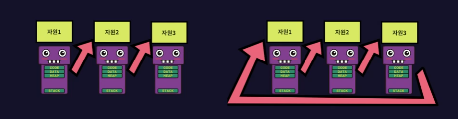 교착상태가 발생하는 이유는 공유자원 때문임.