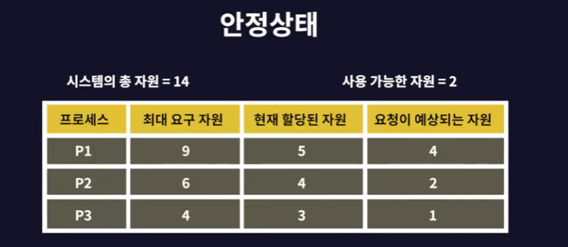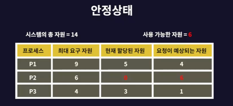전체 자원의 수와 할당된 자원의 수를 기준으로 안정상태와 불안정상태를 나눔.