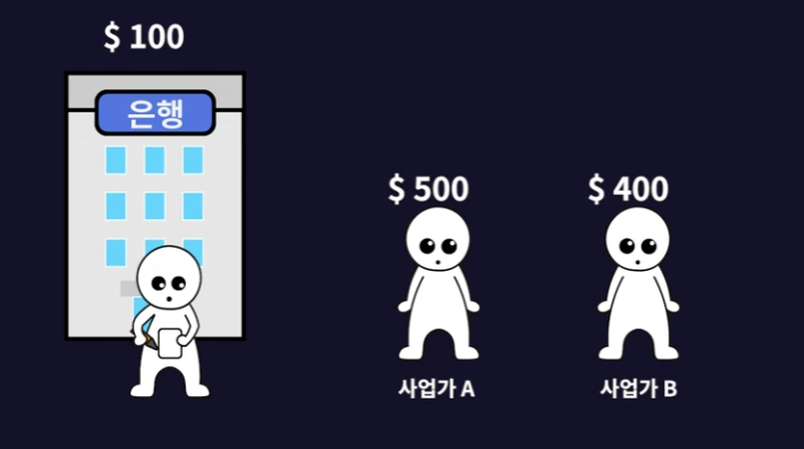 은행은 처음에 1000달러가 있음. a한테 500, b한테 400을 빌려줌. 이제 a한테 갚으라고 했는데 a가 200달러만 더 빌려주면 그걸로 더 벌어서 갚는다함. 그래서 은행이 b한테 가서 돈달라한담에 빌려주려 했더니 b도 마찬가지로 200만 더 빌려주면 갚는대. 아뉘 이러면 은행은 아무것도 못하는 교착상태에 빠짐.